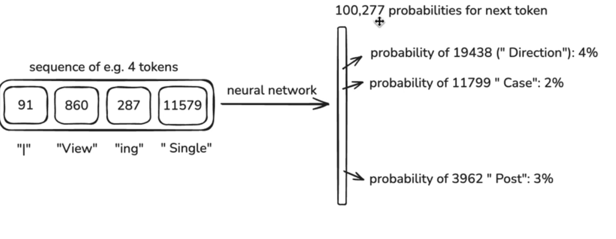 > - **pretraining stage**:将 internet documents 拆分为 tokens,通过神经网络来 predict token sequences