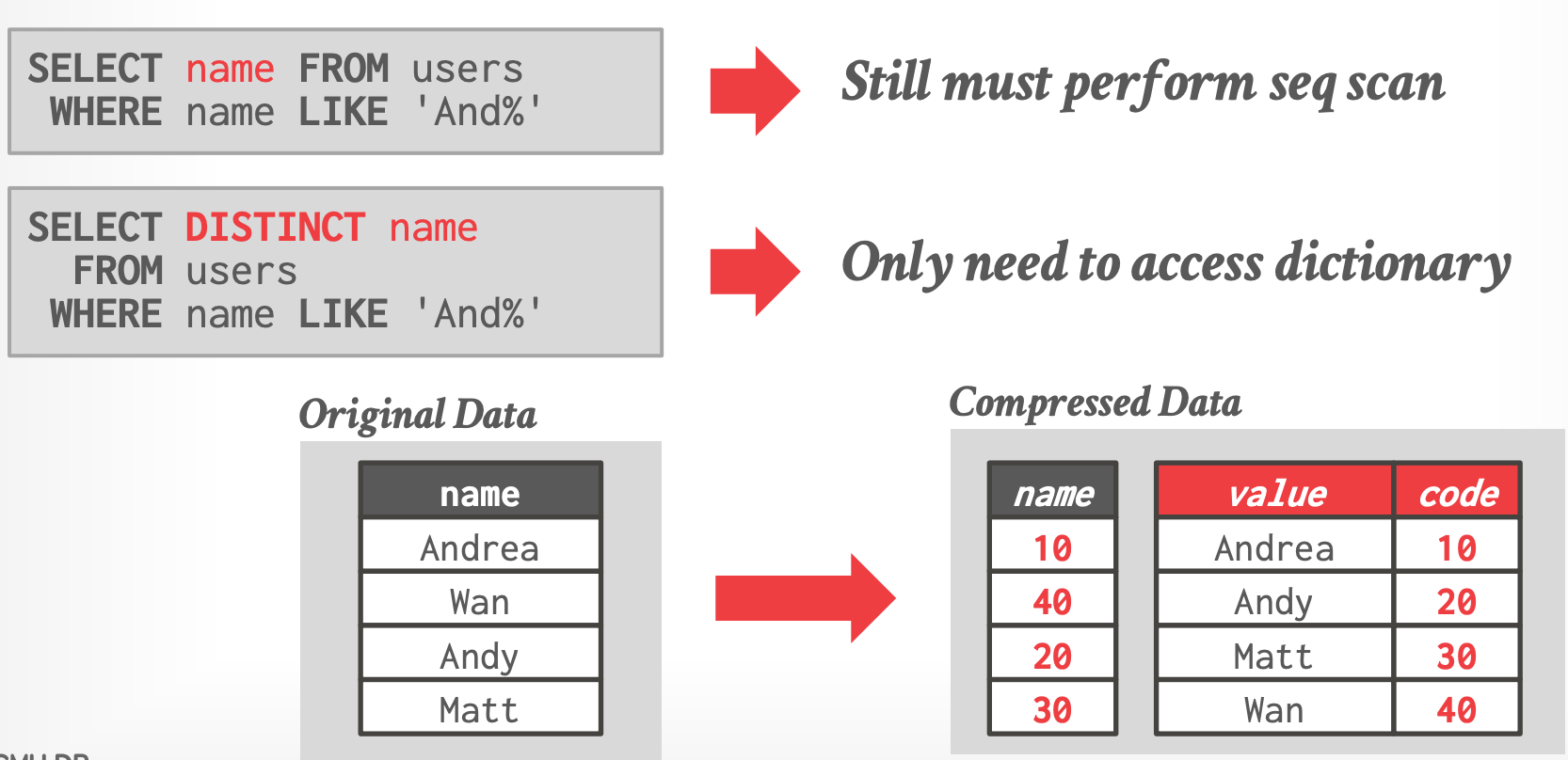 - DBMS 就不能执行谓词下推(例如 **编码谓词**),不能直接在压缩过的数据上操作(除非解压)