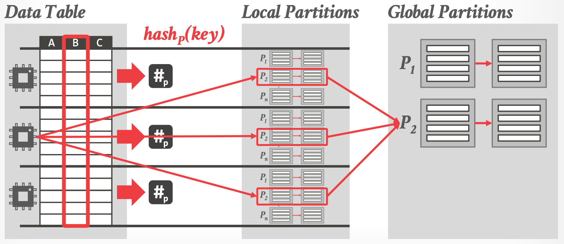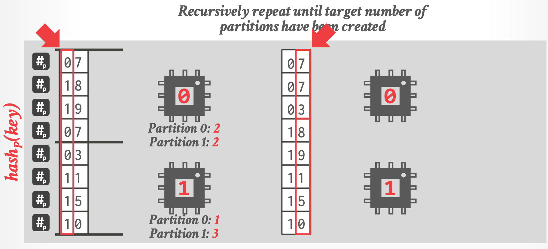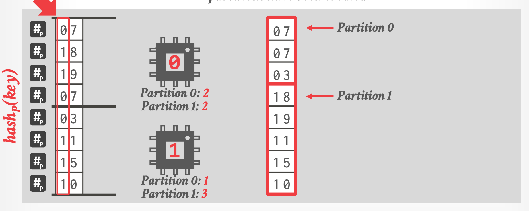 - 通过对 tuple 的 join key 进行 hash 将 input relations 拆分到不同的 partitioned buffers 中