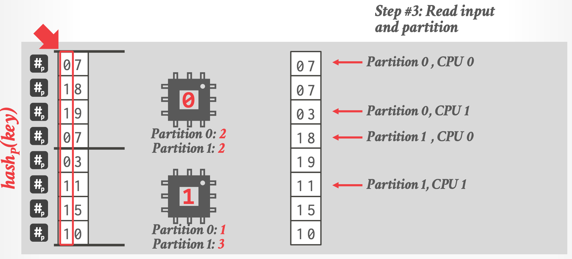 3. Scan R again and partition them according to the hash key.