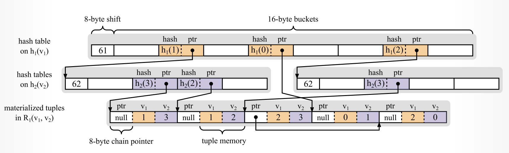 - 不在 nested hash tables 中存储 join keys,而是存储 hash values。