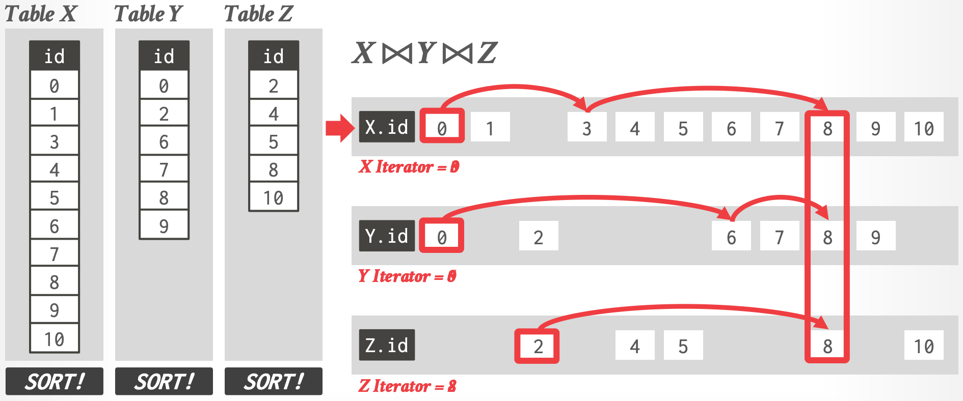 - 执行 join 前,relations 必须按照 join keys 排序 或者实时构建 trie index