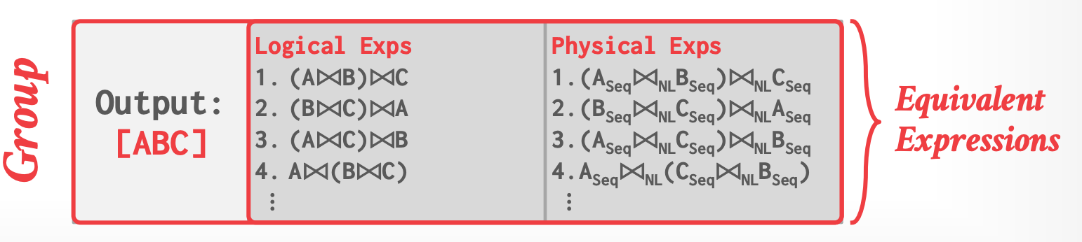 - 一个 group 是一组逻辑上等价的 logical 和 physical expressions,它们输出的结果相同(unordered)